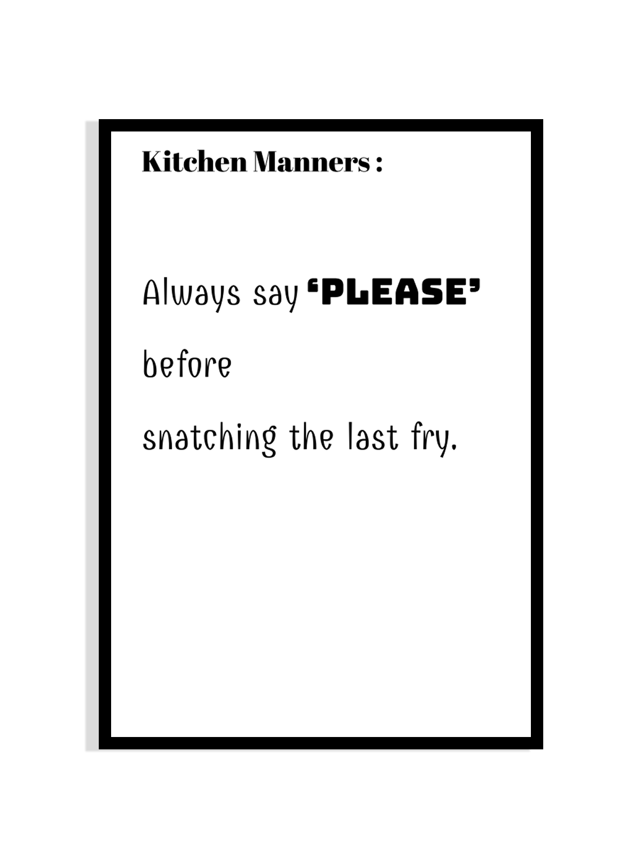 Give your kitchen a charming touch of humor with this framed quote that reminds everyone of basic snack-time etiquette: "Always say ‘PLEASE’ before snatching the last fry." A perfect blend of cheeky and cute, this A4-sized print makes a great addition to cozy kitchens, dining corners, or even food truck setups. It's bold, fun, and irresistibly fry-worthy.