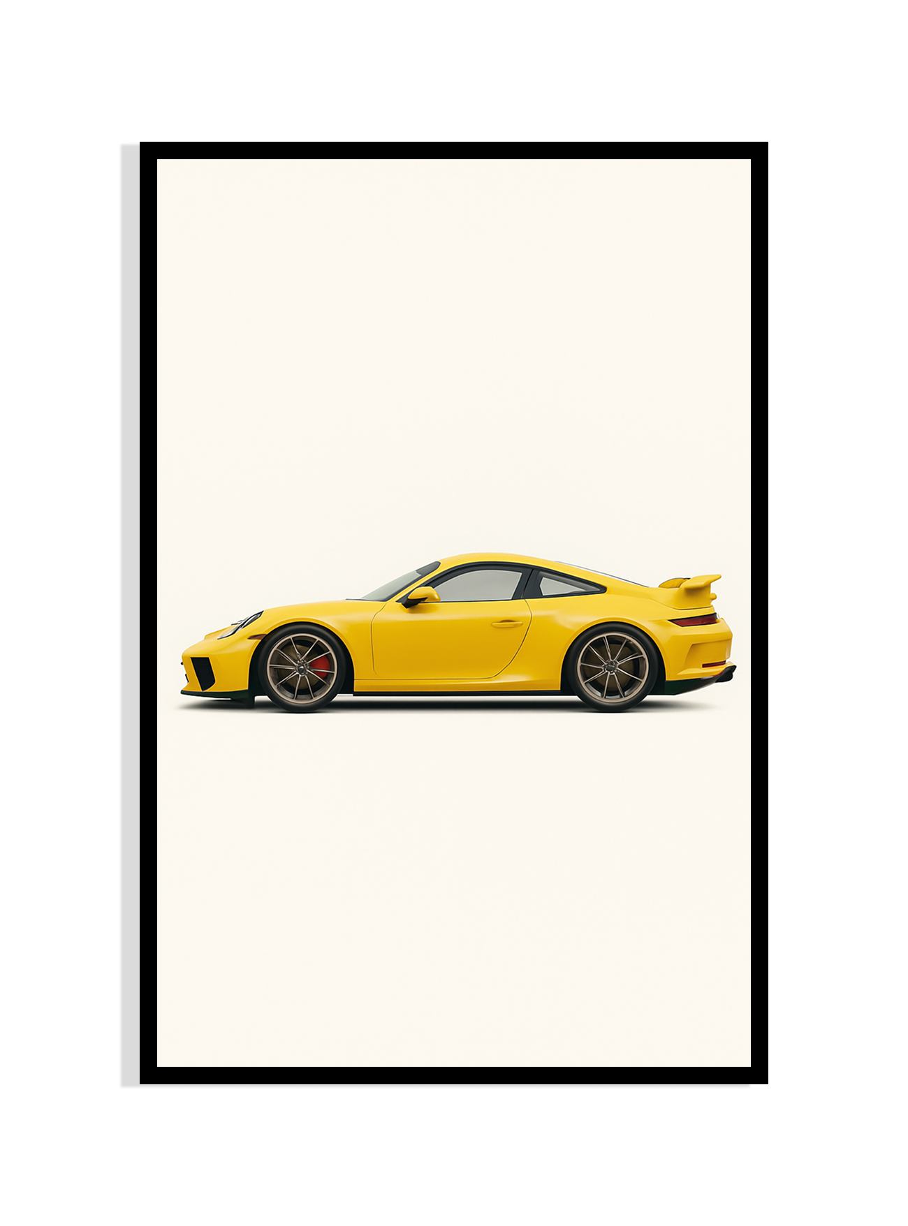 Celebrate automotive perfection with this clean and striking side profile of the iconic yellow Porsche 911 GT3. Set against a subtle beige backdrop and framed in minimalist style, this print is a must-have for car lovers and speed enthusiasts alike. A tribute to performance, precision, and timeless design – perfect for your workspace, garage, or modern home decor.