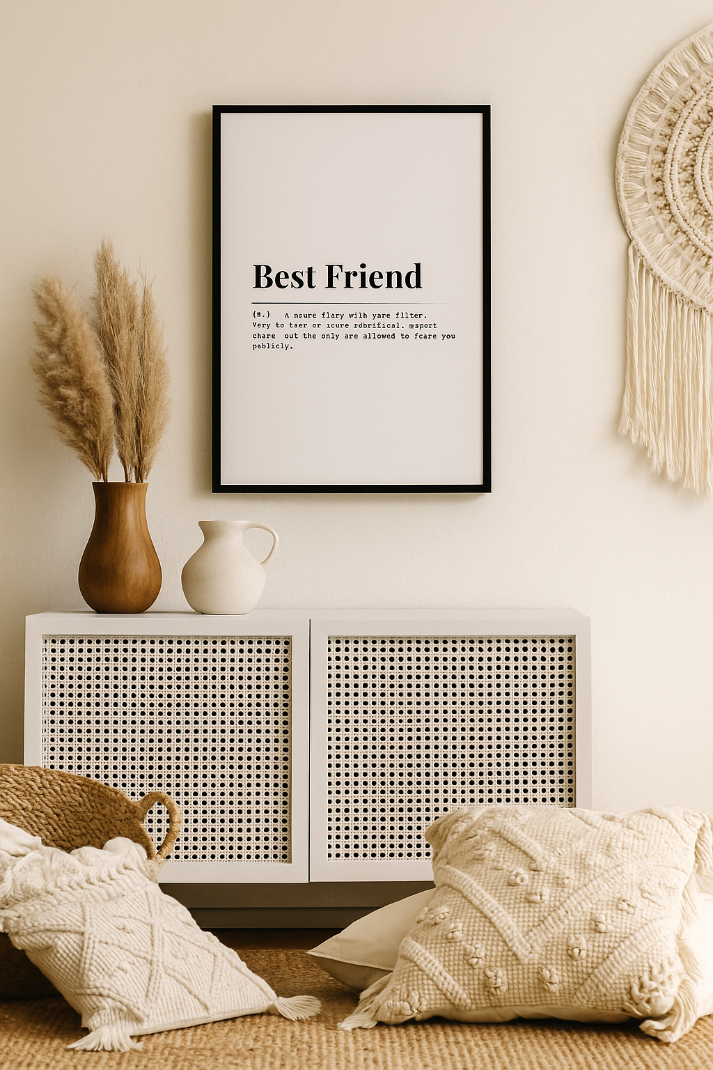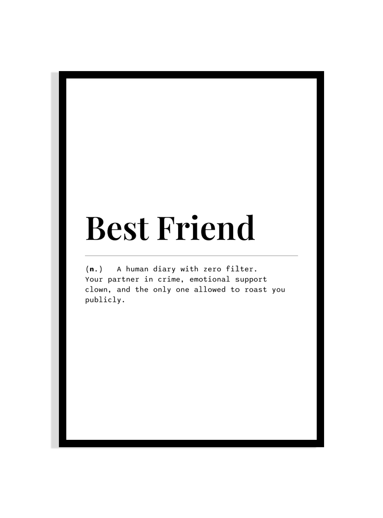 Celebrate your ride-or-die with this hilariously heartwarming typography print. Featuring a witty definition of "Best Friend" — your human diary, emotional support clown, and public roaster — this piece is a perfect gift or personal keepsake for your BFF.