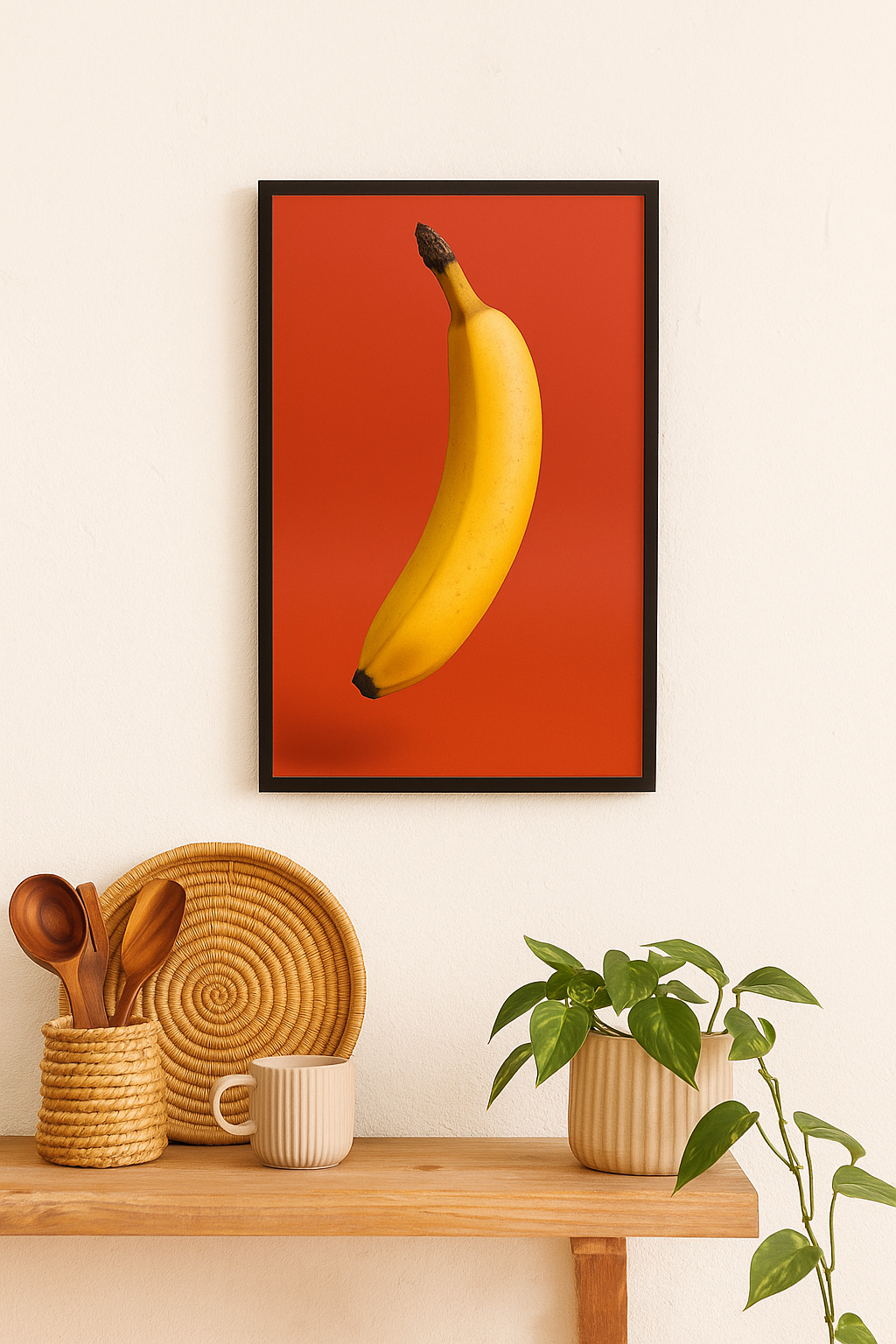 Sometimes, all you need is a banana to make a bold statement. This cheeky framed artwork features a perfectly ripe banana floating confidently against a deep red backdrop. It’s quirky, clean, and surprisingly chic—designed to spark smiles and elevate your kitchen space.