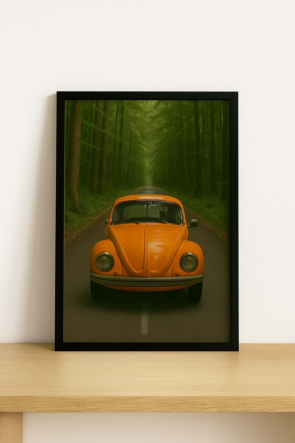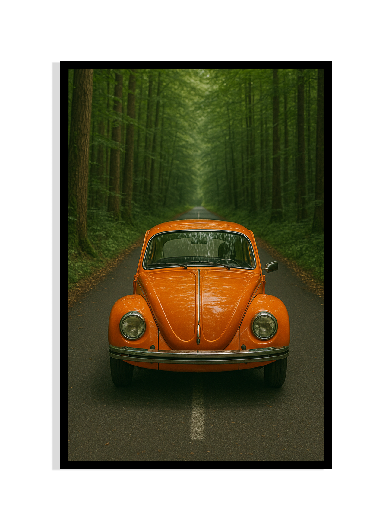 This eye-catching poster captures a vibrant orange Volkswagen Beetle in the heart of a lush green forest, blending iconic automotive design with nature’s serene beauty. The centered front shot emphasizes the car’s timeless charm while the forest road behind evokes a sense of freedom and adventure. A must-have wall piece for car lovers, vintage souls, and those who live for the open road.