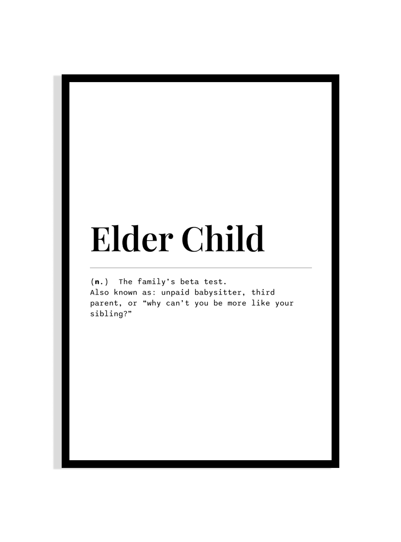 Celebrate the struggles and sarcasm of being the firstborn with our Elder Child definition print. Perfectly capturing the humor, pressure, and eye-roll-worthy expectations that come with the title, this typography art is a hilarious conversation starter. Whether you're gifting it to a sibling or claiming your own title proudly, this minimalistic black-and-white print makes a witty addition to bedrooms, offices, or gallery walls.