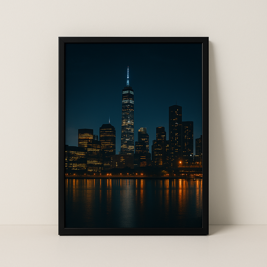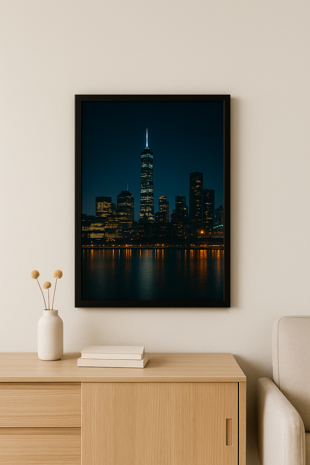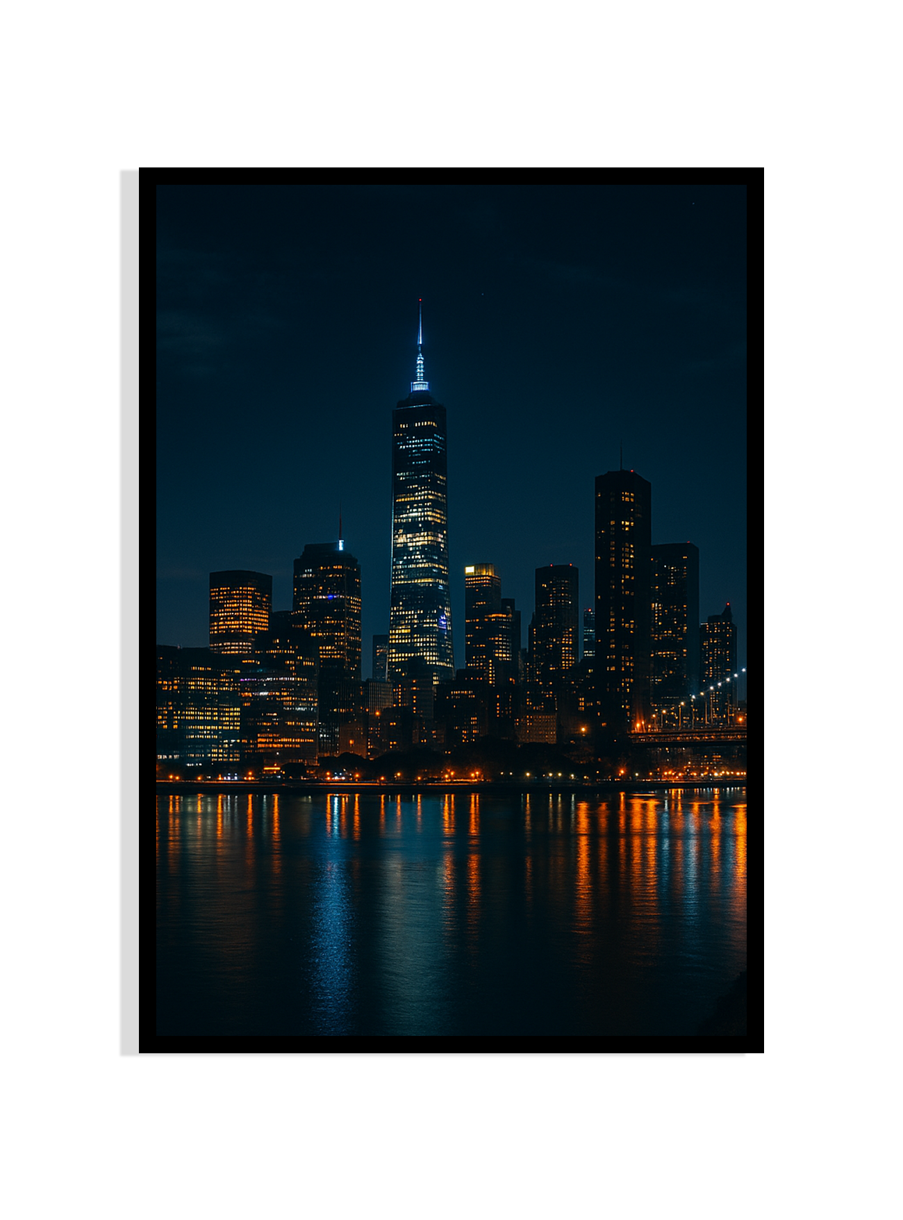 Transform your space with the mesmerizing glow of the Midnight Skyline, a stunning framed print from our exclusive Night Scape Collection. Capturing the heart of a luminous city beneath a velvet sky, this artwork brings the magic of urban nights to your home or office. With reflections dancing on the water and a towering skyline bathed in cool and warm tones, this piece exudes sophistication, tranquility, and modern elegance.