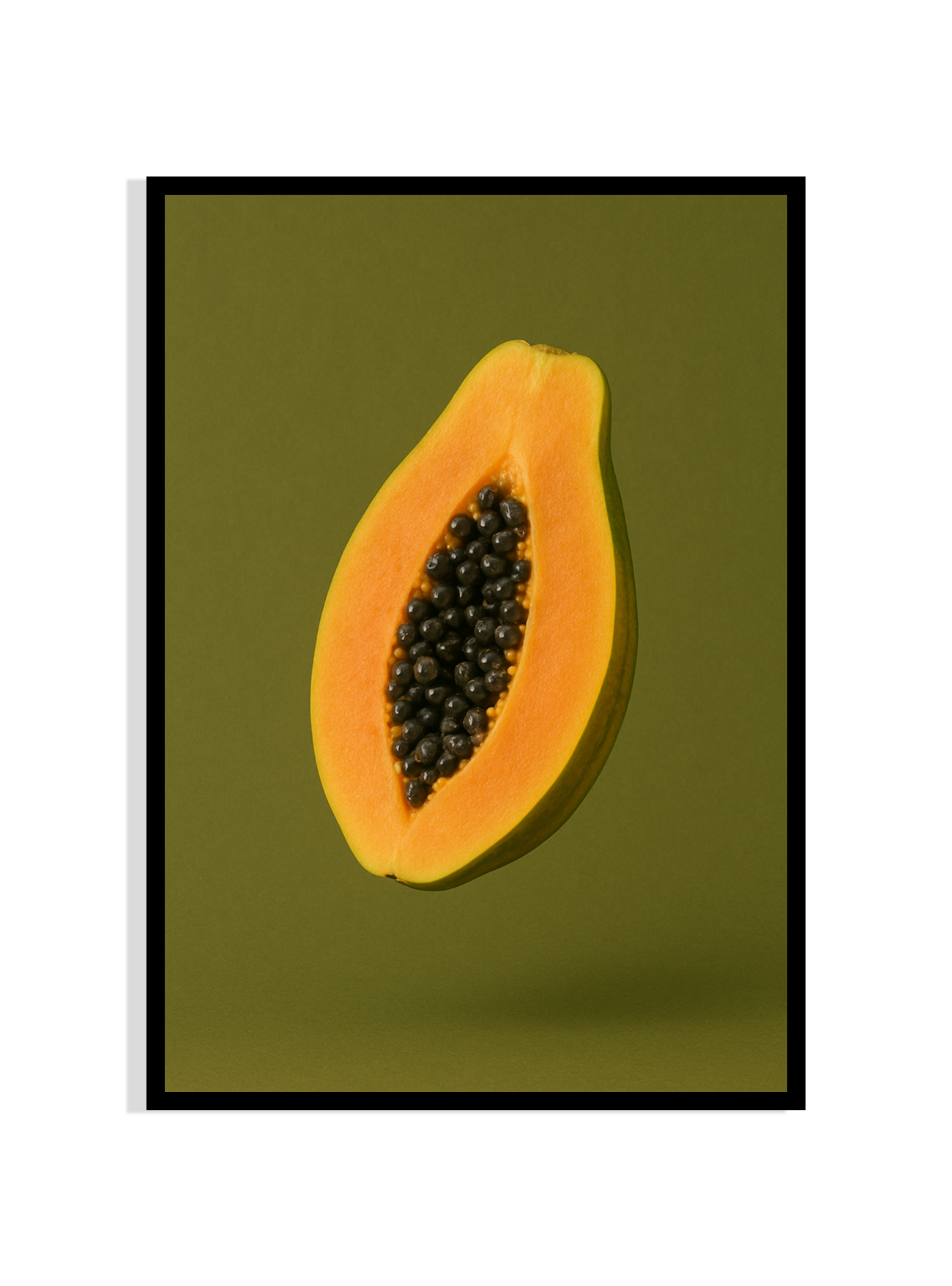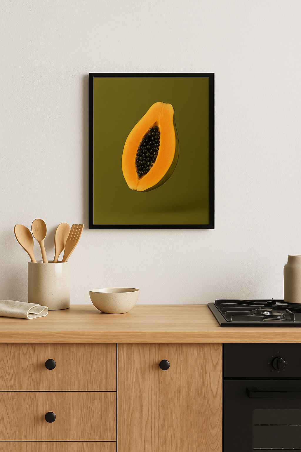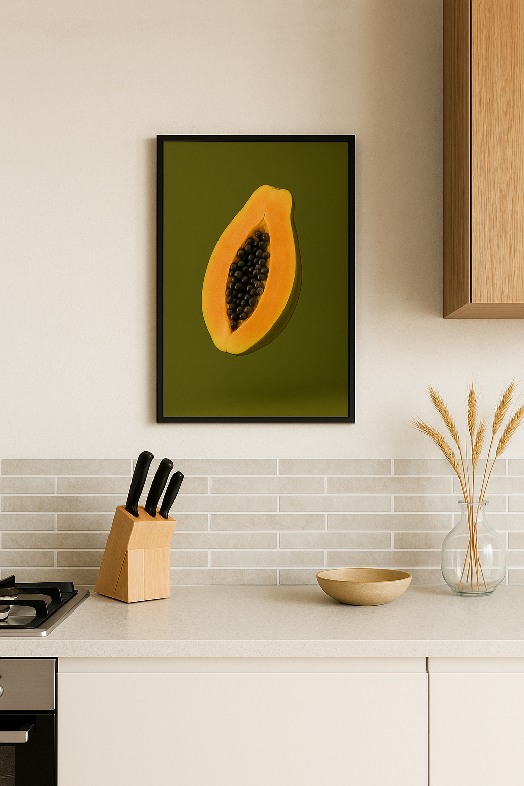 Bring bold tropical vibes to your kitchen with our Tropical Slice framed papaya print. Featuring a vibrant halved papaya with deep orange flesh and glossy black seeds on an earthy olive background, this A4-sized artwork adds a refreshing twist to any culinary space.
