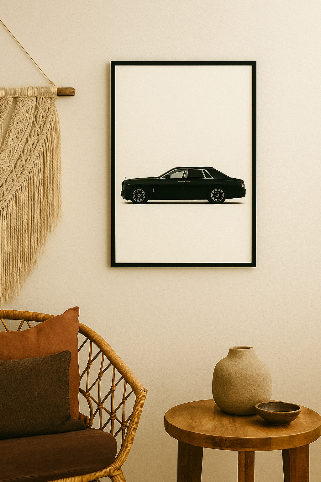 Elevate your space with Phantom Presence, an art gallery–inspired print capturing the understated power of the Rolls-Royce Phantom. This artwork is presented in a minimalist black frame and highlighted by a crisp white backdrop, echoing fine art curation. Designed for those who value quiet luxury, refined taste, and timeless design — a centerpiece for any modern space.