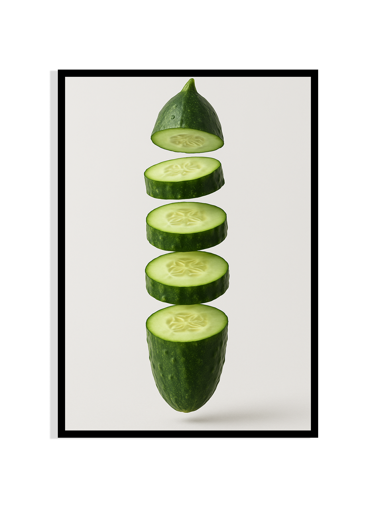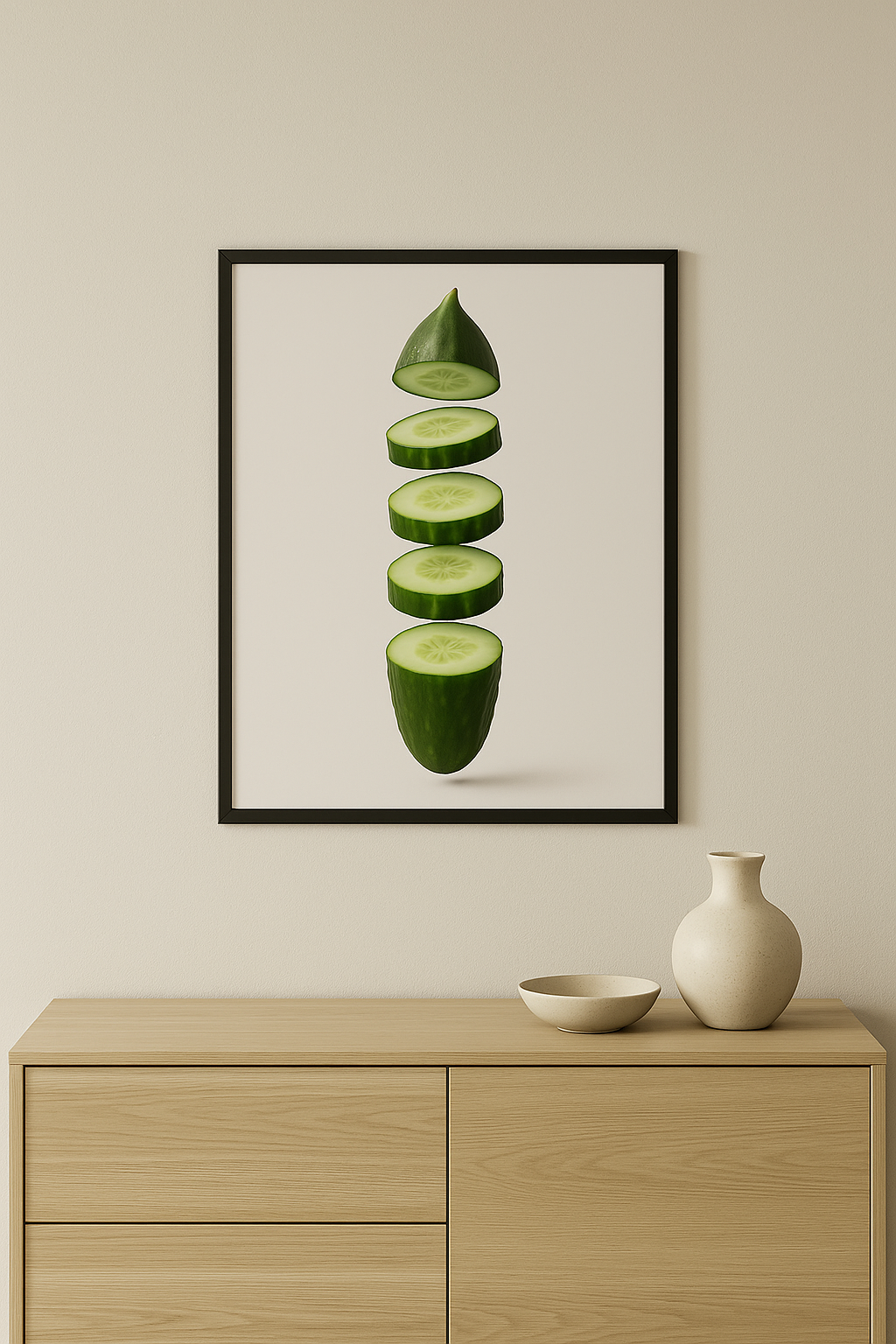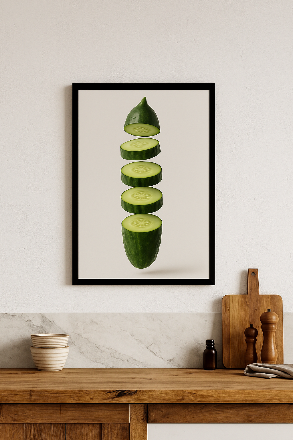 Bring a burst of freshness to your kitchen with this minimalist art print featuring a sliced cucumber suspended mid-air. The clean composition and vibrant green tones add a crisp, refreshing touch to any culinary space. Perfect for modern and natural-themed interiors, this piece captures the essence of kitchen simplicity and farm-to-table vibes.