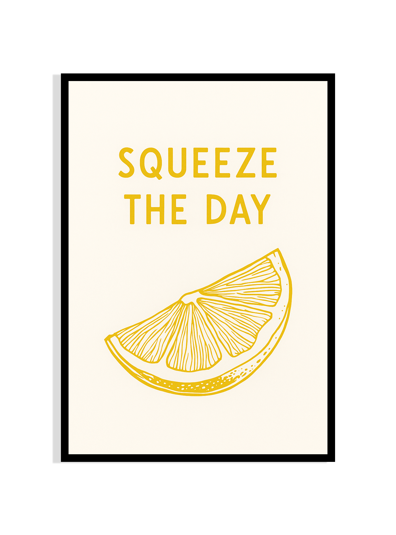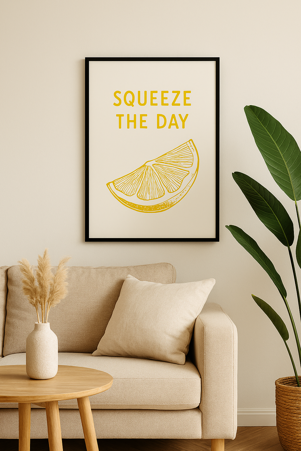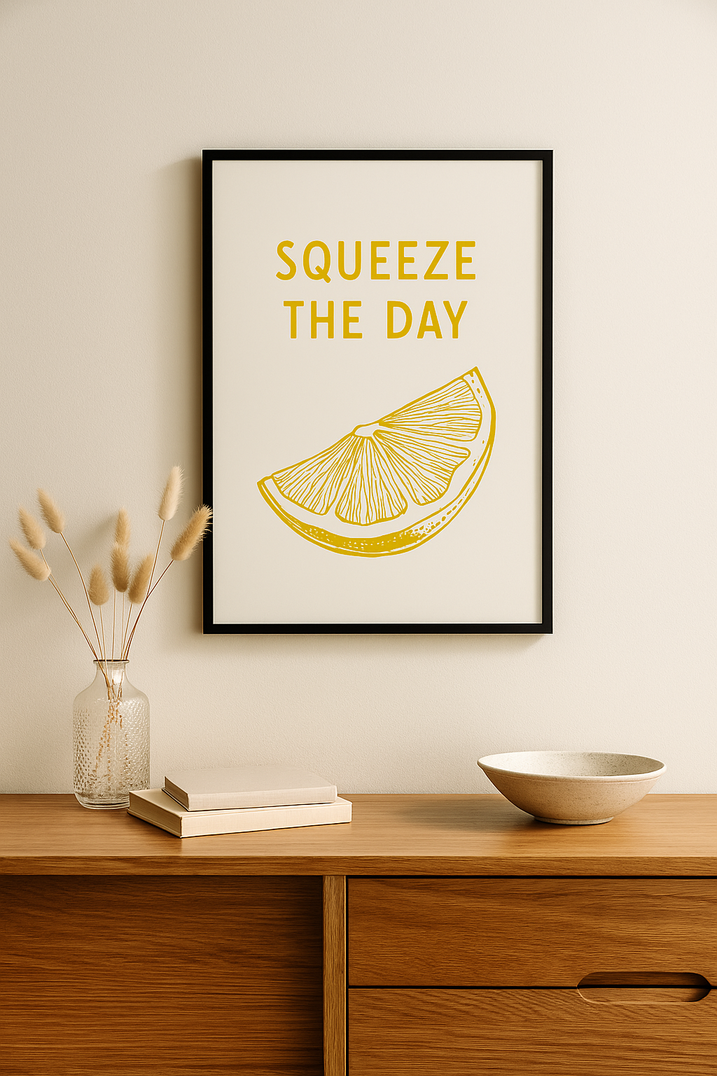 Add a zesty twist to your space with our "Squeeze the Day" framed wall art. Featuring a cheerful lemon wedge and playful typography in a sunny yellow tone, this print brings both charm and motivation to your room. Perfect for kitchens, home offices, or gallery walls, it’s a daily reminder to make the most of every moment—with a squeeze of humor!