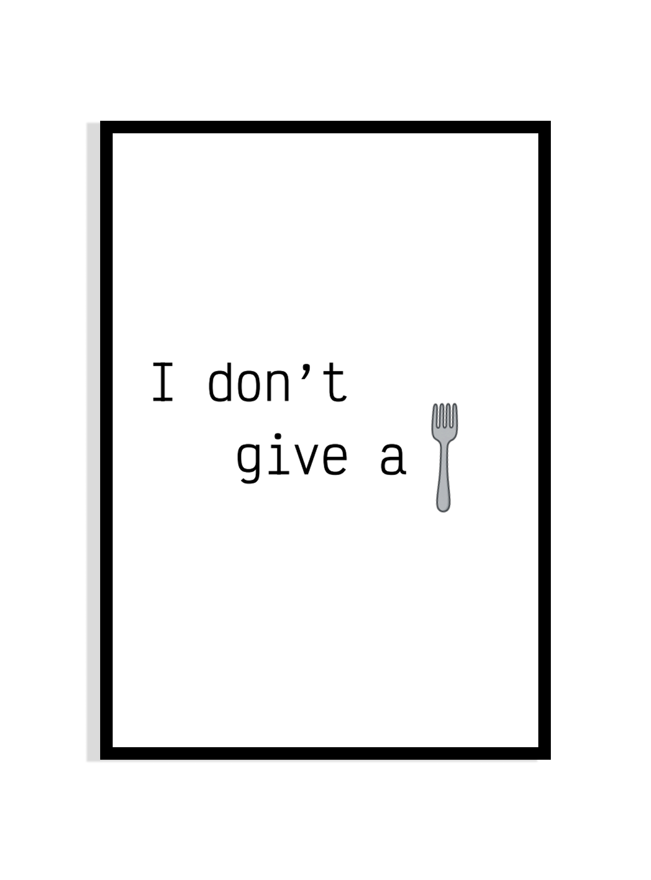 Add a dash of sass to your cooking space with this cheeky framed print. Featuring the witty phrase "I don’t give a [fork emoji]," this minimalist design is perfect for modern kitchens that love a little personality. Set in a clean black frame, it’s a playful conversation starter for foodies and sarcasm-lovers alike. Hang it above your counter, coffee station, or breakfast nook to spice up your kitchen vibes.