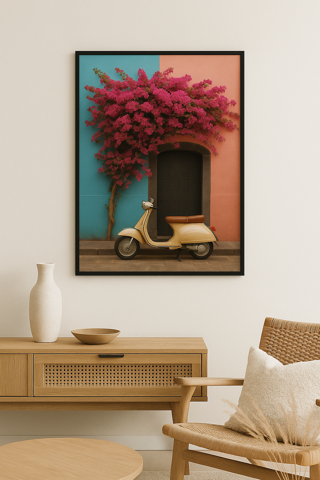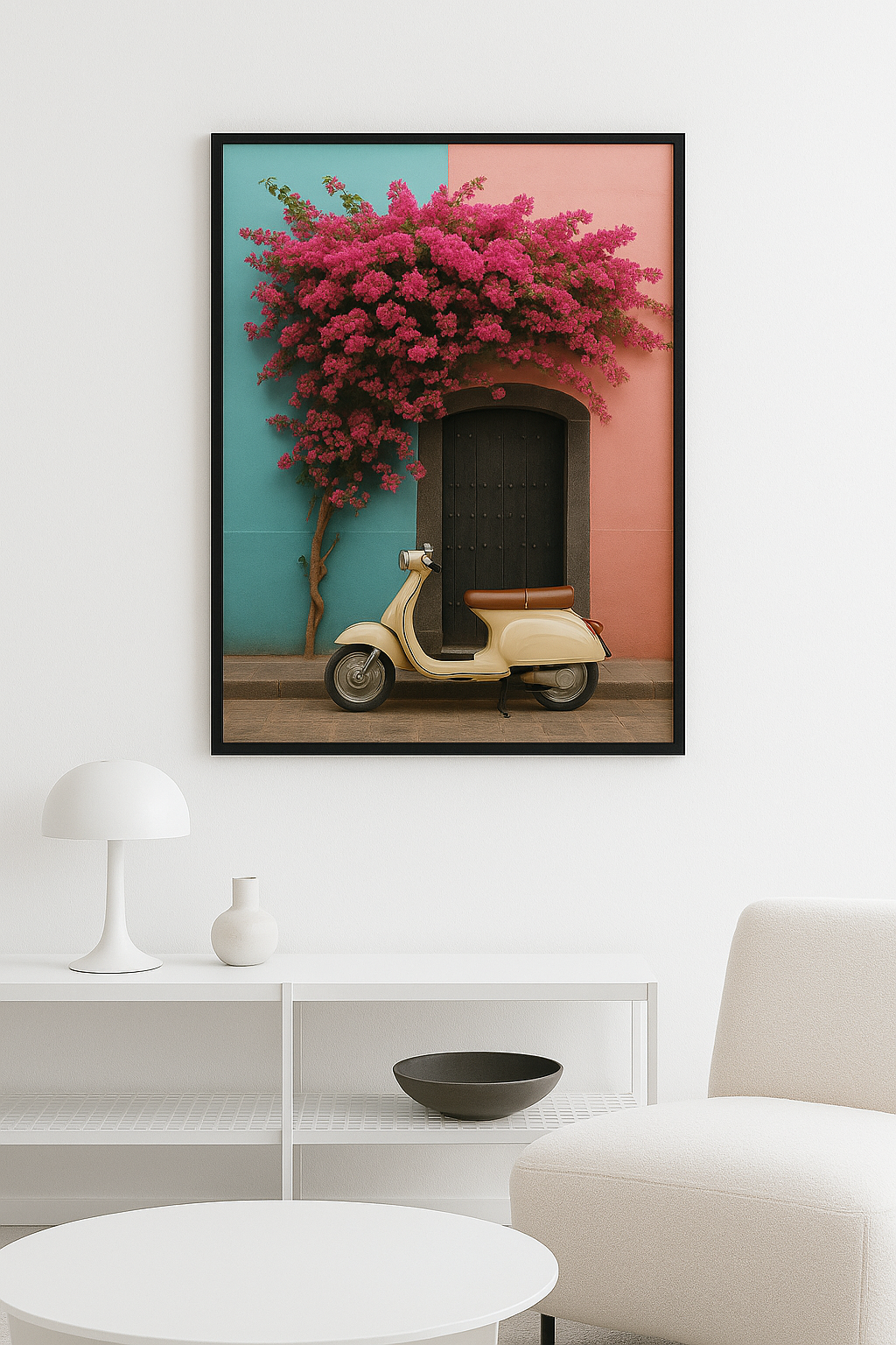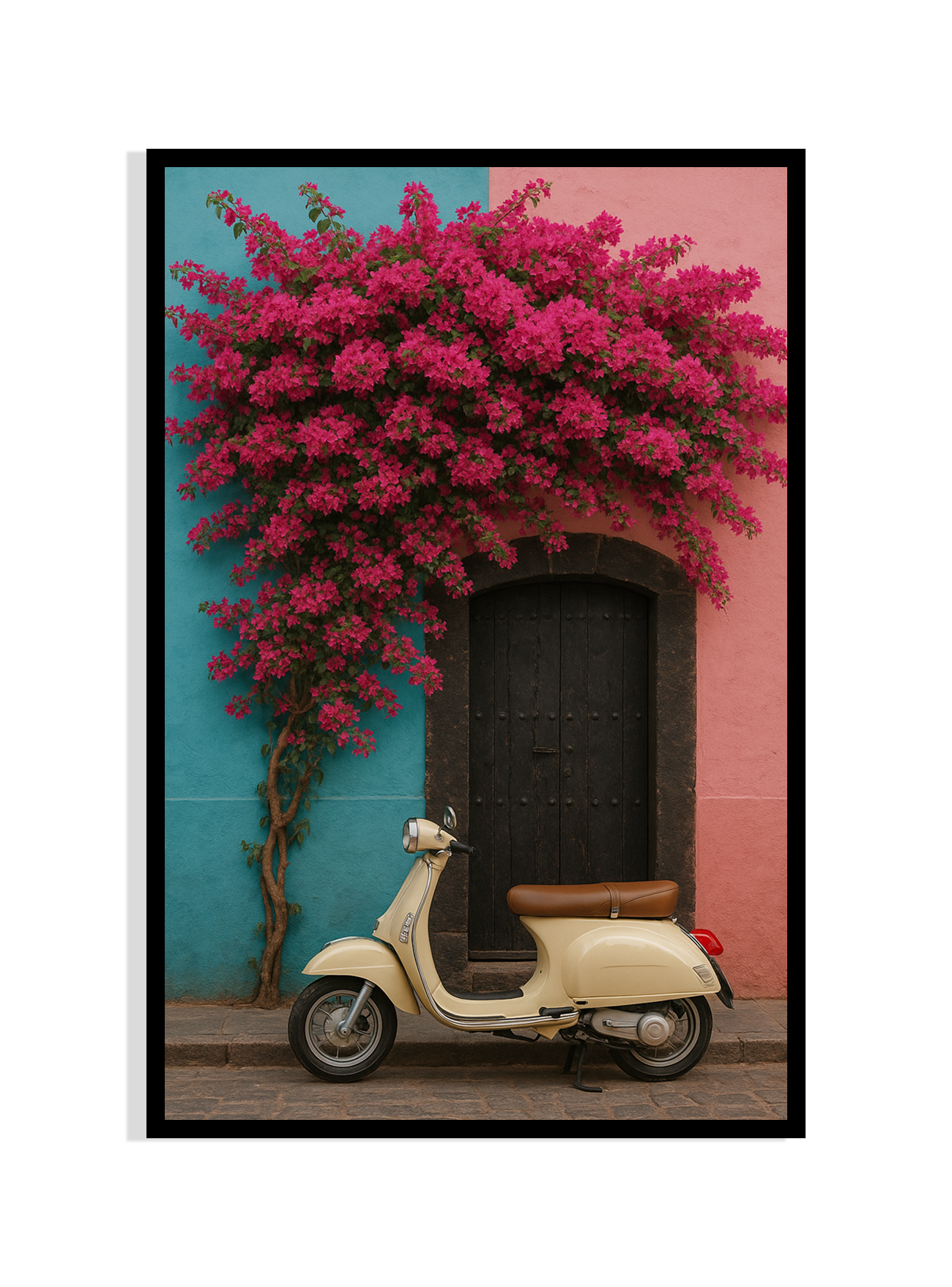 Bring a slice of vintage charm to your space with this poster print featuring a creamy beige Vespa parked by a rustic black door, framed by vivid bougainvillea blooms and vibrant pastel walls. This stunning composition captures the spirit of slow travel, timeless design, and the joy of discovering hidden corners of the world. Ideal for anyone who loves scooters, color-rich scenes, or Mediterranean-inspired decor.